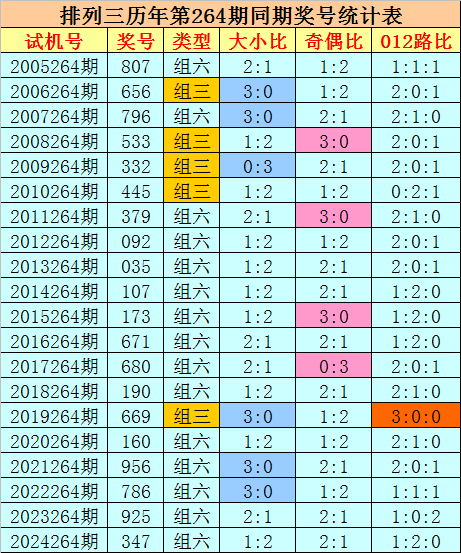大小分析:历史上排列三第264期同期奖号中,大小比0:3开出1期,大小比2:1、3:0开出5期,大小比1:2开出9期,大小奖号总比例开出34:26,大号表现活跃,今年第264期预计大号继续走热,关注大小比2:1。